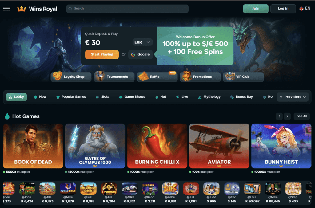 Winsroyal Casino is an innovative gaming hub with exciting features to entertain adventurous players. The premium casino gaming platform has some of the best RTP slots, bonuses, achievement rewards, raffle tickets, multi-language, and payment options.